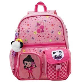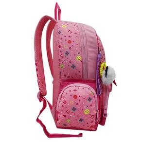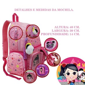 Descrição da mochila: - alças acolchoadas e ajustáveis. - alça de mão. - dois bolsos laterais, sendo um com zíper e o outro para garrafa. - zíper duplo personalizado. - compartimento principal com amplo espaço interno para livros, cadernos e materiais escolares. - bolso pequeno na frente com fecho engate de ímã. - bolso pequeno na frente interativo com cartões para mudar a cor da roupa da luluca. - chaveiro com xuxinha de cabelo;