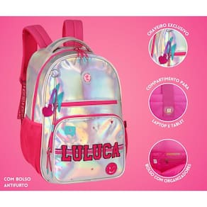 A Mochila Oficial da Luluca é confeccionada em PVC holográfico com silk, tags, patches no painel frontal e fechamento em zíper com puxadores de corda, além de contar com chaveiro em acrílico e um design criativo, fashion e exclusivo da Jovem Youtuber.