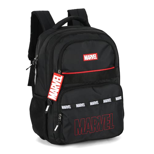 Destaques da Mochila Marvel: Design oficial Marvel, com logo bordado e aplicação em destaque. Combinação de cores em vermelho e preto que traz modernidade e estilo. 2 compartimentos principais com fechamento em zíper reforçado. Bolso frontal amplo com detalhe em fita personalizada "MARVEL". Bolsos laterais em tela para garrafas ou acessórios. Alças acolchoadas e ajustáveis, proporcionando conforto no transporte. Puxadores de zíper exclusivos Marvel. Material resistente, ideal para uso escolar e diário.