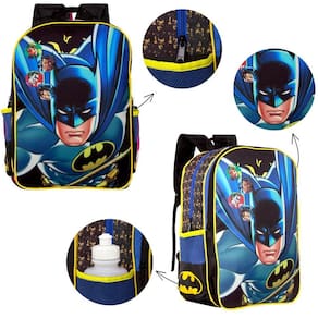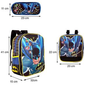 Kit Mochila Escolar Infantil Batman, acompanha lancheira e estojo. Possui alça de mão reforçada. Agora você pode levar sua mochila no seu dia a dia ou acompanhar você na escola. Sua abertura maior se dá por zíper com puxador. Na parte de dentro possui amplo espaço para a guardar diversos materiais como cadernos, livros e estojos. Na parte da frente, possui bolso com zíper para a guardar pertences de menor tamanho e bolsos laterais.
