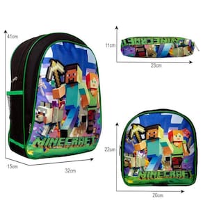 Kit Mochila Escolar Infantil Minecraft, acompanha lancheira e estojo. Possui alça de mão reforçada. Agora você pode levar sua mochila no seu dia a dia ou acompanhar você na escola. Sua abertura maior se dá por zíper com puxador. Na parte de dentro possui amplo espaço para a guardar diversos materiais como cadernos, livros e estojos. Na parte da frente, possui bolso com zíper para a guardar pertences de menor tamanho e bolsos laterais.Características: Alça superior Estampa no bolso frontal Zíper metálico Bolso LateralMedidas Lancheira: Altura: 22cm Largura: 24cmMedidas Estojo: Altura: 11cm Comprimento: 23cmMedidas Mochila: Altura: 41cm Largura: 15cm Comprimento: 32cmDúvidas Frequentes:1. Ela possui alça ajustávelR. Sim, ela possui alça ajustável para melhor conforto.2. Ela possui estampa frontalR. Sim, ela possui estampa frontal3. Ela possui quantas divisõesR. Ela possui 02 divisões para guardar suas coisas.4. Qual o material da mochilaR. Ela é feita em poliéster e plástico.Tags: Mochila, Escola, Escolar, Minecraft, Jogo, Infantil, Costas, Passeio, Estojo, Lancheira, Bolsa, Menino, Juvenil, Reforçada, Desenho. Marca: Toys 2U