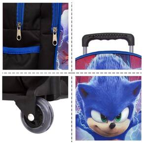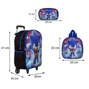 Kit Mochila Escolar Infantil Sonic The Hedgehog Rodinhas, acompanha lancheira e estojo. Possui alça de mão reforçada. Agora você pode levar sua mochila no seu dia a dia ou acompanhar você na escola. Sua abertura maior se dá por zíper com puxador. Na parte de dentro possui amplo espaço para a guardar diversos materiais como cadernos, livros e estojos. Na parte da frente, possui bolso com zíper para a guardar pertences de menor tamanho e bolsos laterais.