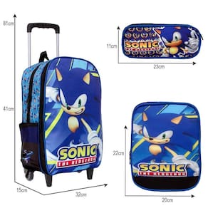 Kit Mochila Escolar Infantil Sonic Rodinhas, acompanha lancheira e estojo. Possui alça de mão reforçada. Agora você pode levar sua mochila no seu dia a dia ou acompanhar você na escola. Sua abertura maior se dá por zíper com puxador. Na parte de dentro possui amplo espaço para a guardar diversos materiais como cadernos, livros e estojos. Na parte da frente, possui bolso com zíper para a guardar pertences de menor tamanho e bolsos laterais.