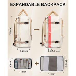 Característica: mochila de viagem resistente à água para mulheres com característica expansível tem uma capacidade de embalagem de 40 a 52 L, que tem espaço e bolsos suficientes para itens pessoais e itens essenciais de viagem. O compartimento para sapatos com 2 orifícios respiráveis é embutido na parte inferior da mochila de caminhada para manter os sapatos e outros itens de viagem limpos separados. O bolso de armazenamento de sapatos pode armazenar de 5 a 14 tamanhos de sapatos femininos. A mochila feminina grande vem com 2 organizadores para manter os itens organizados e fáceis de encontrar. Grande cubo de mochila de viagem de itens pessoais aprovada pela companhia aérea com design de malha para proteger as roupas de emaranhamento. Cubo pequeno com lateral transparente para uma visão clara dos produtos de higiene pessoal. Mochila de viagem leve para mulheres com design TSA atende aos padrões de bagagem de mão para companhias aéreas, cabe no compartimento superior e no espaço embaixo do assento. Esta mochila de transporte para aeroporto com porta de carregamento USB e cabo integrado facilita carregar seu telefone enquanto caminha ou pedala. Esta mochila de viagem bege para laptop com cabeças de zíper duplo de metal é composta de poliéster leve e impermeável. Costura reforçada atualizada e zíperes resistentes fazem com que esta mochila moderna dure mais tempo. Presente ideal para mulheres, esposa, mãe, amigas, namorada no Dia de Ação de Graças e Natal. - Grande capacidade e design expansível: Tamanho: 21 x 15 * (8,5 + 1,5) polegadas. Capacidade de embalagem de 40 a 52 l. Peso: 1,2 kg. Esta mochila de viagem extra grande para mulheres tem uma característica expansível. Um compartimento separado para laptop pode conter um computador de 17,3 polegadas enquanto evita que o laptop se mova. O compartimento principal da mochila de viagem de 50 l com bolsos de rede tem espaço suficiente para guardar cubos, bolsa de maquiagem, roupas, bolsa para câmera e itens essenciais de viagem de 5 a 7 dias (verifique o tamanho do seu laptop) - Compartimento para sapatos e 2 organizadores de embalagem: a mochila de viagem com compartimento para sapatos tem 2 orifícios respiráveis embutidos na parte inferior da mochila de viagem para manter os sapatos e outros itens limpos separados. O bolso para sapatos pode armazenar de 5 a 14 tamanhos de sapatos femininos. A mochila de mão feminina vem com 2 organizadores para manter os itens organizados e fáceis de encontrar. Grande cubo de mochila de viagem feminina com design de malha protege as roupas de emaranhamento. Cubo pequeno com lateral transparente para uma visão clara dos produtos de higiene pessoal - Conveniência e conforto: mochila de viagem leve para mulheres com design TSA atende aos padrões de bagagem de mão para companhias aéreas, cabe no compartimento suspenso. A mochila de transporte aprovada é mais conveniente do que as malas tradicionais, já que é mais fácil de transportar em aeroportos lotados, deixando suas mãos livres para outras tarefas. Com alças de ombro ajustáveis e painel traseiro ventilado de malha de ar confortável, a mochila para laptop de negócios por muito tempo não vai desgastar você. Presentes para viajantes - Funcionalidade e segurança: a mochila de transporte expansível com porta de carregamento USB e cabo integrado facilita o carregamento do seu telefone enquanto caminha ou anda. Observação: Power Bank não está incluído. Uma alça de bagagem prende a mochila de viagem de fim de semana à alça da bagagem com rodinhas para transporte sem usar as mãos e facilitar o transporte. Um bolso oculto antirroubo na parte de trás da mochila para mulheres protege a carteira e o passaporte. Mochila de bagagem de mão para viajantes protegerem a propriedade e a privacidade - Alta qualidade e econômica: esta mochila de viagem bege para laptop com cabeças de zíper duplo de metal com trava é composta de poliéster leve resistente à água. Costura reforçada atualizada e zíperes resistentes fazem com que a mochila de mala de viagem dure mais tempo. A mochila de mala noturna geralmente é mais acessível do que as malas tradicionais, o que a torna uma ótima opção para viajantes preocupados com o orçamento. Presente ideal para mulheres, esposa, mãe, amigas, namorada no Dia de Ação de Graças e Natal
