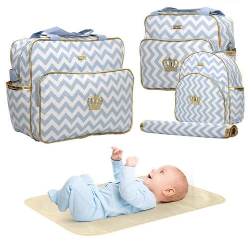 Esse Kit acomoda tudo que é necessário para o seu bebê Para acompanhar a mamãe desde a maternidade até quando seu bebê for maior. O design prático e elegante torna esta bolsa perfeita para viajar com muito espaço e conforto. A mochila maternidade conta com diversos compartimentos para deixar seus itens bem organizados. Peças forradas em material branco e impermeável, reforço em nossas alças para maior resistência e durabilidade de sua peça.Conteúdo:- 1 Bolsa Grande- 1 Bolsa Media- 1 Mochila- 1 TrocadorMedidas:- Bolsa Grande: 25cm de Altura 17cm de Largura 32cm de Comprimento- Bolsa Média: 25cm de Altura 17cm de Largura 26cm de Comprimento- Trocador: 49cm de comprimento 33 cm de largura 2mm de espessura- Mochila: 30cm de Altura 16cm de Largura 27cm de Comprimento- Material: 100% PVC acoplado reforço em lã de polipropileno + 100% Poliéster de alta qualidade- Alça de ombro costurada. A alça de ombro possui regulador metal dourado para ajuste de tamanho.- Alça de mão dupla - Coroa e Plaquinha da Marca produzidas em Metal Dourado- Tipo de Fecho: Zíper- Amplo espaço internoCuidados:- Guarde em um local seco e arejado.- Evite colocar excesso de peso no produto para não forçar os zíperes e costuras.- Proteja os objetos cortantes e/ou pontiagudos evitando o contato direto com o produto.- Para a limpeza utilize apenas pano úmido com sabão neutro.- Não lavar diretamente com água e não utilizar alvejantes ou componentes químicos.Dúvidas Frequentes:1. Possui ajuste de alçaR. Sim, ela possui ajuste de alça em todas as peças.2. Qual o tipo de fechamentoR. As bolsas possuem fechamento em zíper.3. Ela possui forro internoR. Sim, ela possui forro interno não térmico.4. Ela possui bolsos lateraisR. Sim, ela possui bolsos laterais.Tags: Bolsa, Mala, maternidade, Bebê, Baby, Mamãe, Multifunção, Mochila maternidade, menino, Coroa, Menina, Grande, Pequena, Saída Maternidade, Luxo.