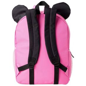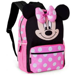 A mochila infantil Minnie Mouse rosto grande é indicada para crianças em idade pré-escolar, com estrutura em poliéster leve, painel frontal com rosto da personagem, orelhas em relevo e laço acolchoado, compartimento principal para cadernos pequenos, estojo e lancheira, bolso frontal com zíper para itens de acesso rápido, dois bolsos laterais em tela para garrafinha e alças de ombro acolchoadas e ajustáveis com alça superior para pendurar em gancho ou armário. ? Ficha Técnica: