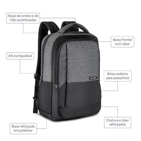 - Costura e zíper reforçados - Alças traseiras acolchoadas e reguláveis - Poliéster de qualidade e alta durabilidade - Compartimento interno para acessórios + bolso acolchoado para notebook com cinta protetora.