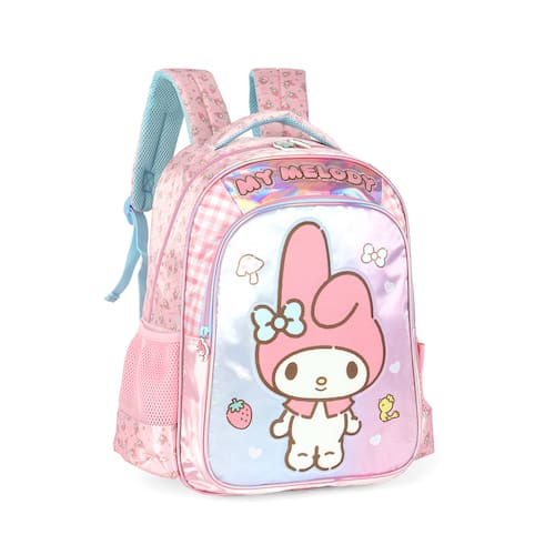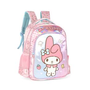 Design encantador: estampa exclusiva da My Melody com acabamento em efeito holográfico brilhante. Amplo espaço interno: ideal para guardar cadernos, livros, pastas e materiais escolares. Bolsos laterais em tela: perfeitos para garrafinhas e pequenos objetos. Alças ajustáveis e acolchoadas: proporcionam conforto mesmo em longos períodos de uso. Reforço interno e costuras resistentes: garantindo maior durabilidade. Zíper de fácil abertura: para mais praticidade no dia a dia.