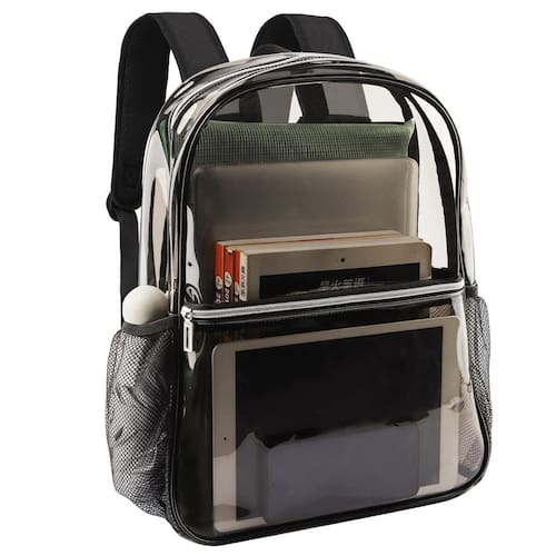 mochila transparente - TPU grosso e resistente: a mochila transparente é feita de TPU grosso inodoro, é resistente, macia e mais ecológica. que é muito superior ao PVC, TPU para maior vida útil, o que é muito adequado para uso diário. - Compartimentos multifuncionais: 1 compartimento principal grande para fichários, laptops, livros, sapatos, etc., com 1 pequeno bolso interno de malha para caber no seu telefone, cartões, etc., 1 compartimento frontal para estojos de lápis, óculos, etc., 2 bolsas laterais de malha para guardar garrafas de água ou guarda-chuvas dobráveis. A mochila transparente oferece um bom espaço para diferentes fins. - Alças acolchoadas reforçadas – Os pontos reforçados da alça são adotados para fixar a alça com firmeza; as alças acolchoadas macias proporcionam uma experiência de uso confortável; o comprimento da alça pode ser ajustado de 40,6 cm a 78,7 cm. - Tamanho perfeito – LWH: 35,5 x 14,5 x 43,7 cm, esta mochila transparente é grande o suficiente para guardar tudo o que você precisa, como livros pesados, estojos de lápis, garrafa de água e outros trabalhos; a bolsa para laptop serve para laptop de até 15 polegadas. - Multiuso: mochila transparente perfeita para o trabalho, biblioteca, museu, viagens, parques, esportes, piquenique, pesca, caminhadas, shows e carnavais, etc; atende totalmente às suas necessidades diárias.