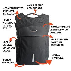 Mochila moderna com todo estilo e conforto que você precisa e merece Já começo descrevendo a parte frontal com refletivo , composição mesclando Nylon e microfibra , possui 3 compartimentos sendo o principal com espaço para note . Muito legal !!! possui entrada USB e cadeado com senha . Nas costas alça camiseta com regulagem que traz modernidade e conforto com gomos de massagem em EVA . Vamos as medidas PARA NOTE ATE 17” TAMANHO 46CM X 32CM X 17CM .