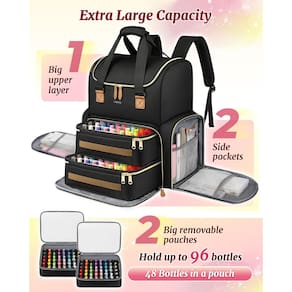 A mochila organizadora de esmalte extra grande da YOREPEK é o presente perfeito para profissionais de unhas e entusiastas. Com um design de duas camadas, a camada superior comporta itens grandes, como uma lâmpada UV, removedor de esmalte e acessórios de unha. A camada inferior possui duas bolsas removíveis que armazenam com segurança até 96 frascos de esmalte de 15 ml, com compartimentos de esponja para organização. Há dois bolsos laterais para pincéis e lixas de unhas, e um bolso de malha na aba para adesivos e pontas de unhas. Este elegante e espaçoso organizador de esmaltes é um ótimo presente de Natal ou aniversário para manicure, amigos, esposas ou filhas.