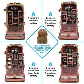 Feita com couro Crazy Horse para mostrar o estilo vintage. Projetou uma mochila de grande capacidade para fotógrafos se ajustarem ao que precisam. Espaço acessível para caber em todos os equipamentos e pode ser removido para uso diário. O tripé pode ser colocado na lateral/inferior da mochila. - Design para fotógrafos. Com as divisórias acolchoadas removíveis, você pode personalizar facilmente o espaço da mochila da câmera para caber em todos os seus equipamentos. O acesso lateral rápido permite que você capture todos os momentos bonitos. - Grande capacidade. As dimensões da mochila para câmera são 33 cm C x 21,6 cm L x 45,7 cm A, peso 1,7 kg. Cabe perfeitamente em 1 DSLR com lente acoplada, 2 câmeras, 4 lentes padrão, laptop de 16 polegadas na capa do laptop e outros acessórios ou itens pessoais, como carregador portátil. - Design vintage. A mochila para câmera é feita de lona encerada e couro de cavalo louco, que é resistente à água, robustez e durável. Com o desgaste, ela mostrará as mudanças nos tons de cor e reflete o visual vintage. - Design de segurança. A abertura traseira antirroubo mantém todo o seu equipamento seguro. O compartimento acolchoado grosso pode manter todos os seus equipamentos seguros. Ela também tem um suporte de tripé na lateral e na parte inferior. - Nunca sacrifique o conforto. A mochila para câmera é feita de acolchoamento respirável nas costas, alças de ombro de malha de ar e alça no peito para proporcionar conforto para uso diário em caminhadas e viagens.