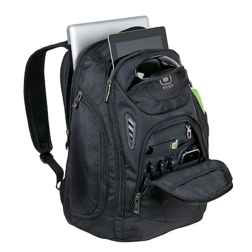 OGIO Mochila para laptop 411065 Mercury de 17 polegadas, preta - Compartimento frontal com divisória de arquivos; bolso traseiro acolchoado para laptop - Capa acolchoada para tablet/e-reader; bolso organizacional - Bolso forrado com lã para mídia digital/áudio ou objetos de valor; dois bolsos laterais com zíper - Bolso de malha para bebidas; painel traseiro de malha de ar ultra acolchoado com canais de ventilação - Alças confortáveis com amortecedores elásticos, laço para óculos de sol e bolso elástico