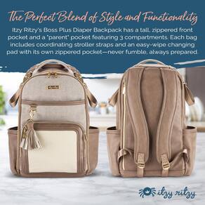 Itzy Ritzy Mochila para fraldas – Mochila Boss Plus de grande capacidade para bebês com 19 bolsos, trocador de fraldas, clipes para carrinho de bebê e alças confortáveis, Vanilla Latte Boss Plus - 19 bolsos multifuncionais: a mochila de fraldas Itzy Ritzy'ss Boss Plus possui 19 bolsos multifuncionais. De 13 bolsos internos a 6 externos, incluindo 2 bolsos isolados para garrafas, esta bolsa tem o que você precisa. Medindo 36 cm C x 25 cm L x 45 cm A, esta espaçosa bolsa de fraldas oferece amplo espaço para todos os itens essenciais do seu bebê. - Acesso rápido na ponta dos dedos: nossa mochila de fraldas Boss Plus vai além para os pais. Com um bolso externo frontal alto com zíper e um bolso frontal "mãe" de fácil acesso equipado com 3 bolsos e um cordão para chaves, você nunca se atrapalhará com o que precisa. - Alças para carrinho de bebê e almofada de troca fácil de limpar: projetada para pais modernos, cada mochila de fraldas para bebês Boss Plus vem com alças de carrinho de bebê coordenadas e uma almofada de troca fácil de limpar que tem seu próprio bolso com zíper. Além disso, o trocador apresenta adoráveis impressões de "cabeça e pés", facilitando a troca de fraldas, a qualquer hora, em qualquer lugar. - Pés de borracha com novo design trançado: a bolsa de fraldas Boss Plus apresenta nossos pés de borracha exclusivos com um novo design trançado na parte inferior da mochila. Nossos pés de borracha exclusivos oferecem estabilidade suficiente para manter a bolsa na vertical e a parte inferior limpa, não importa o quanto você a encha. - Elegantemente moderna, clássica chique: eleve seu estilo com nosso design Vanilla Latte Boss Plus. Esta requintada mochila de fraldas apresenta um interior impresso com logotipo e uma borla removível de couro vegano adornada com um pingente de corrente gravado, adicionando um toque de sofisticação ao seu conjunto. Nossas bolsas de fraldas Boss Plus são tão elegantes que também podem ser usadas como bolsas de trabalho, bolsas de ginástica ou bagagem de mão durante a viagem, prolongando sua utilidade por muito tempo depois que seu bebê crescer as fraldas.