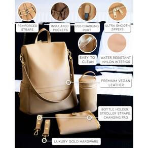 - Materiais premium – ao contrário de outras marcas, esta bolsa de fraldas recentemente redesenhada oferece zíperes YKK da mais alta qualidade, ferragens douradas de luxo, couro vegano premium, interior de nylon fácil de limpar e alças reforçadas para maior durabilidade e conforto
