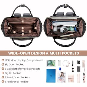 LOVEVOOK Mochila para laptop feminina, moda feminina.., Preto, Mochilas de viagem - Mochila feminina de couro LOVEVOOK atualizada para laptop?: Costuras reforçadas e resistentes. Feita de couro PU impermeável de alta qualidade, alças de ombro grossas, alças de couro exclusivas, zíperes antiderrapantes. Resistente e durável. Total de 2 compartimentos e 19 bolsos, fácil de organizar todas as necessidades de trabalho, suprimentos universitários e itens essenciais de viagem. Dimensões: 45,7 x 33 x 21 cm; Peso: 1,4 kg. - Mochila acolchoada estilosa para laptop ?: Cabe bem em laptops de até 18 polegadas, compartimento para tablet para iPad de 12,9 polegadas. Esta mochila feminina é acolchoada em todos os lados e na parte inferior. O compartimento dedicado para laptop com algodão acolchoado costurado ao redor maximiza a proteção física de seus dispositivos eletrônicos. - Mochila universitária profissional com abertura ampla: as bordas reforçadas e a estrutura de aço do compartimento principal mantêm a forma perfeita da bolsa e o uso durável. Muito espaço para tudo para ajudar a se manter organizado e acessar rapidamente. Profissional e bem feita para o trabalho, negócios, viagens, deslocamento, faculdade, professor, enfermeira, uso diário como um presente prático para mulheres. - ?Ótima mochila de viagem para viajar de avião com porta de carregamento USB?: Tamanho perfeito para caber sob o assento do avião e fixa-se à alça elevada da mala para facilitar a viagem. Nossa mochila de viagem LOVEVOOK de couro está equipada com uma porta de carregamento USB integrada, fácil de carregar seu telefone quando estiver em movimento (não inclui o carregador portátil). - ??Compra sem risco e garantia de qualidade?: A LOVEVOOK está comprometida em fornecer aos nossos clientes mochilas e serviços de alta qualidade. A mochila feminina de couro LOVEVOOK oferece atendimento ao cliente 12 horas, devolução sem motivo em 90 dias e política de garantia de 1 ano.