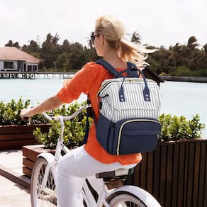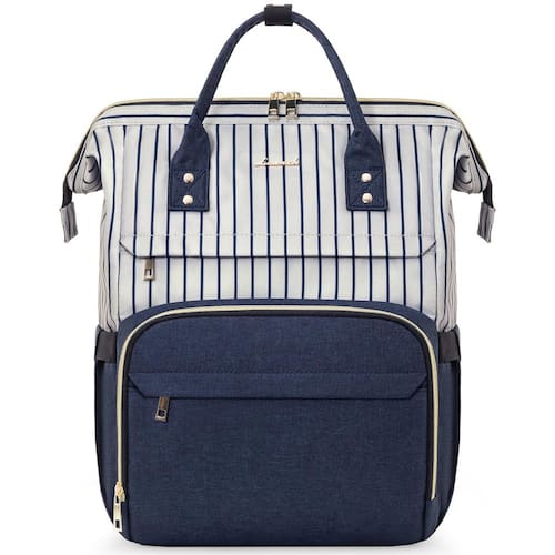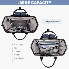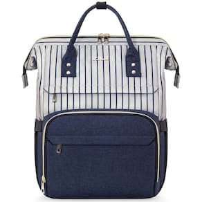 Esta mochila tem muitos bolsos. É perfeito para o local de trabalho. É espaçoso. Você é capaz de carregar seu iPad, 2 grandes fólios, 2 (1/2) livros de polegada, carteira, retoque básico de maquiagem, óculos de sol, garrafa de água, chaves e carregador de iPhone. Fácil de carregar como uma bolsa ou mochila. A qualidade da costura é ótima e não há um monte de cordas soltas ou bordas mal ajustadas. Os zíperes dourados são muito bonitos — resistentes e com zíper fácil. Geral: Esta bolsa é um excelente ajuste para alguém que está procurando uma bolsa de computador de alta qualidade e quer ficar bem enquanto usa! Então vá em frente. - Nylon, cabe até 39,6 cm, mochila de trabalho elegante - Ferragens prateadas, bolso lateral elástico para garrafa de água ou guarda-chuva, com uma porta de carregamento USB e capa para carrinho, bolso traseiro antirroubo - Compartimentos espaçosos e robustos e organizados. É resistente o suficiente para ficar em pé e não cair quando embalada, e você aproveitará a maneira como ela abre e permanece aberta! você pode encontrar tudo o que precisa sem se atrapalhar cegamente em um fundo escuro - Multiuso: seu visual simples e elegante de cores listradas a torna uma mochila para laptop, mochila de trabalho, mochila de viagem, mochila universitária e mochila. Também é leve nas costas, mesmo com livros didáticos, pastas e laptops dentro - Compre com confiança: esta mochila vem com uma política de devolução de 90 dias e suporte ao cliente 7D/24h. Mantenha seus itens essenciais de negócios organizados em movimento com facilidade e estilo