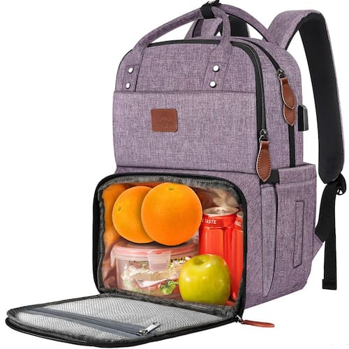 Compartimentos multifuncionais. Compartimento principal --- Espaço espaçoso com compartimento acolchoado separado para laptop que pode caber em laptops de até 15,6 polegadas Compartimento isolado --- Dimensão: (C) 11 x (L) 5,5 x (A) 19,8 cm, pode armazenar até 10 latas (330 ml). Trabalhada com parede isolada espessa, a lancheira pode manter a comida quente, mas também manter as bebidas frias por cerca de 3 a 5 horas. Bolsos frontais -- 1 bolso organizador frontal com zíper + 1 bolso frontal aberto. Deixa seus suprimentos diários organizados e fáceis de acessar Bolsos laterais -- 1 bolso lateral para garrafa de água e guarda-chuva e 1 bolso lateral para lenços de papel Bolso antirroubo -- Bolso antirroubo na parte de trás para proteger seus pertences Bolso para cartão -- permite acesso rápido aos seus cartões quando necessário. Mochila térmica de almoço de 39,6 cm 1 Estrutura resistente feita de material de alta qualidade, robusto, resistente à água, resistente a rasgos e máxima durabilidade. O forro interno é feito de excelente material de qualidade alimentar e fácil de limpar. 2 Excelente isolamento. A lancheira é feita de material isolado que pode manter alimentos e bebidas frescos ou quentes por mais de 4 horas. Além disso, o forro interno é feito de camada de alumínio de grau alimentício para que você possa colocar seus alimentos diretamente na bolsa. A espuma EPE espessa integrada oferece ótima proteção para seus recipientes, alimentos e bebidas. 3 Deformáveis quando você não precisa carregar comida, o compartimento da lancheira pode ser dobrado, para que você possa carregar muitos itens (por exemplo, casaco, jeans, pijama, bolsa de cosméticos, carteira...) 4 portas de carregamento USB com uma porta de carregamento USB externa e um cabo de carregamento interno, é conveniente carregar seu celular e outros dispositivos eletrônicos enquanto caminha (Observação: precisa trabalhar com seu próprio carregador portátil) 5 relatórios de teste reutilizáveis de agitação de carga mostram que a lancheira pode suportar mais de 5.000 vezes a máquina agitando continuamente quando a lancheira carrega 10 kg - Compartimento isolado para lancheira: o compartimento isolado da mochila de almoço é engrossado com espuma e funciona junto com a camada de alumínio para manter a comida quente, mas também manter as bebidas frias por cerca de 3 a 5 horas. Permite que você desfrute de comida deliciosa a qualquer momento. Dimensão do compartimento do recipiente de alimentos: 28 x 19,8 x 14 cm (pode conter até 10 latas) - Grande capacidade: com capacidade máxima de 23 L, a lancheira universitária possui 1 compartimento principal grande com compartimento para laptop de 15,6, 15, 14 e 13,3 polegadas, 2 bolsos frontais para seus suprimentos, 2 bolsos laterais para guarda-chuva ou lenço facial. É conveniente para uma variedade de aplicações, seja para um piquenique ao ar livre para seus amigos, ou armazenando alimentos e lanches para o almoço para você e sua família, ou use como uma mochila para laptop - Design de deformação: quando você armazena alimentos ou frutas no compartimento da lancheira, a área do compartimento principal será reduzida para fornecer mais espaço para o compartimento do recipiente de alimentos. Quando você não precisa carregar alimentos, a camada isolada pode ser dobrada para que você possa carregar mais itens no bolso principal. Uma combinação de lancheira e mochila para laptop. Você não deve perder esta mochila feminina - Design multiuso: quando você armazena alimentos ou frutas no compartimento da lancheira, o compartimento principal será reduzido para fornecer mais espaço para o compartimento de alimentos. Quando o compartimento do almoço estiver vazio, a camada isolada pode ser dobrada para que você possa carregar mais itens no bolso principal. Uma combinação de lancheira e mochila para laptop. Perfeita para mais ocasiões como: trabalho, esporte, caminhadas, pesca, praia, acampamento, viagens, etc - Resistente e confortável: a lancheira grande com isolamento térmico é feita de tecido robusto e impermeável que não rasga, rasga ou arranha, mas também leve. As almofadas de malha respirável nas alças de ombro facilitam o transporte por muito tempo. Pode ser um presente de aniversário de casamento para esposa, namorada, mãe, amigas