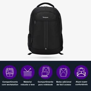 Marca: Targus Modelo: Mochila para notebooks Targus City 15.6 - TSB89004 Cor: Preto Tamanho compartimento Notebook: 15.6 Material: Poliéster Capacidade: 25L Dimensões -AxLxC-: 45x31x13,5 Peso: 510g Garantia do Produto: 1 Ano Garantia Zíper e Costura: Vitalícia.