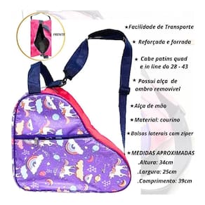 A Bolsa De Transporte Para Patins Quad Roller - Cor; Unicórnio lilás com Rosa Pink é a opção perfeita para quem busca praticidade e conforto ao transportar seus patins quad. Feita com material leve e resistente em material sintético, essa bolsa oferece uma proteção reforçada para guardar e transportar seus patins quad e inline. Essa bolsa é perfeita para os patinadores que querem se destacar durante os passeios. Além disso, ela foi desenvolvida para ser versátil e suportar diferentes tamanhos de patins infantis quad, proporcionando facilidade e leveza no transporte. A Bolsa De Transporte Para Patins Quad Roller possui alças ajustáveis e removíveis, permitindo que você a carregue tanto nos ombros quanto nas mãos. Além disso, ela conta com bolsos laterais com zíper, proporcionando espaço extra para guardar pequenos objetos. Com medidas aproximadas de altura: 34cm, largura: 25cm e comprimento: 39cm, essa bolsa é compacta e prática, ideal para levar seus patins para onde quiser. Seu material em material sintético garante durabilidade e resistência, além de ser fácil de limpar. A Bolsa De Transporte Para Patins Quad Roller é perfeita para quem busca conforto e praticidade no transporte de seus patins. Garanta já a sua e tenha seus patins sempre protegidos e prontos para a diversão. Especificações técnicas: - Material: material sintético - Cor: Unicórnio lilás com Rosa Pink - Alças ajustáveis e removíveis - Bolsos laterais com zíper - Medidas aproximadas: altura: 34cm, largura: 25cm, comprimento: 39cm 1. Essa bolsa é compatível com patins quad e inline Sim, essa bolsa foi desenvolvida para suportar diferentes tamanhos de patins quad, proporcionando facilidade e leveza no transporte. 2. Posso carregar a bolsa nos ombros e nas mãos Sim, a Bolsa De Transporte Para Patins Quad Roller possui alças ajustáveis e removíveis, permitindo que você a carregue tanto nos ombros quanto nas mãos. 3. A bolsa possui espaço extra para guardar pequenos objetos Sim, ela conta com bolsos laterais com zíper, proporcionando espaço extra para guardar pequenos objetos. 4. Qual o material da bolsa A bolsa é feita com material leve e resistente em material sintético, garantindo durabilidade e resistência. 5. Quais são as medidas aproximadas da bolsa A bolsa possui medidas aproximadas de altura: 34cm, largura: 25cm e comprimento: 39cm, sendo compacta e prática para transportar seus patins.
