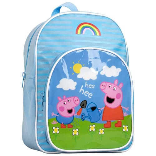 Peppa Pig A mochila possui Peppa & George e seria um presente perfeito para qualquer fã! Ideal para escola, berçário ou dias fora, esta mochila é composta por um compartimento principal mais um bolso frontal, ambos com fechos de zíper. Possui duas alças traseiras ajustáveis e um laço para pendurar na parte superior. Com gráficos brilhantes na frente da mochila. - Peppa Pig Mochila George Pig - Uma mochila bonita e prática com Peppa e George brincando no jardim contra um fundo azul - Vem com um bolso principal com zíper e bolso frontal, bem como alças ajustáveis práticas - Dimensões: 11 x 9 x 3 polegadas - Mercadoria oficialmente licenciada pela Peppa Pig