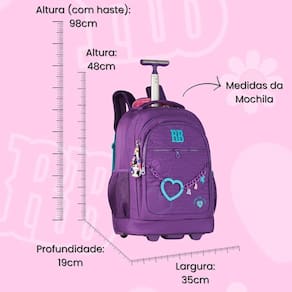 Mochila Rebecca Bonbon De Rodinhas Juvenil Escolar Mala Teen - Clio Style A Mochila Rebecca Bonbon é perfeita para meninas que buscam praticidade e estilo. Feita com materiais de alta qualidade, essa mochila de rodas é resistente e espaçosa, ideal para carregar livros, cadernos e outros itens escolares. Possui compartimentos bem organizados, alças convenientes e acolchoadas para maior conforto, além de um design moderno e delicado, com detalhes que encantam. Características Mochila: Alça de mão e costas Bolsos laterais telados Bolso interno para lápis e caneta Chaveiro e corrente personalizado Mascote em 3D Forro rosa logado Puxador personalizado Zíper tratorado Cadarço acetinado logado Placa de metal colorida Proteção para asas e rodas Especificações Mochila: Marca: Clio Style Medidas Aproximadas Mochila A x L x P : 48cm x 35cm x 19cm Altura com a haste levantada: 98cm Aprox Peso: 2.022kg Aprox Capacidade: 31L Composição do produto: Poliéster Polegadas: 19 Compartimento para Notebook: 15 Conteúdo da Embalagem: Rb27009 - 1 Mochila de Rodas Rebeca Bonbon As cores podem variar entre as imagens mostradas acima e o produto. Imagens meramente ilustrativas. Todas as informações divulgadas são de responsabilidade exclusiva do fabricante. de 90 dias contra defeito de fabricação. Marca: Não Informado