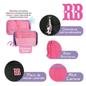 Cheia de charme e personalidade, a Mochila de Costas Rebecca Bonbon RB27015 é a escolha ideal para quem ama estilo, organização e praticidade no dia a dia Confeccionada em material soft com matelassê em formato de corações, ela encanta pelos detalhes delicados e acabamento premium. Possui plaquinha de metal exclusiva Rebecca Bonbon, cadarço acetinado colorido e puxadores de zíper personalizados, que completam o visual moderno e divertido. Acompanha cartela de adesivos. O compartimento principal é espaçoso, ideal para levar livros, cadernos e materiais escolares com conforto e segurança. Conta ainda com dois bolsos frontais com fechamento por zíper, perfeitos para manter os objetos mais sempre à mão, além de bolsos telados laterais para garrafinhas e bolso antifurto na parte de trás. A RB27015 foi feita pensando no conforto: suas alças de costas são acolchoadas, ajustáveis e ergonômicas, e a alça de mão superior reforçada garante praticidade no transporte. Outro grande diferencial é a alça carona, perfeita para acoplar em malas e facilitar a locomoção em viagens ou passeios. E, para deixar tudo ainda mais encantador, a mochila acompanha um chaveiro exclusivo de miçangas, um mascote 3D superfofo e uma corrente com coração emborrachado e pingentes, além de uma cartela de adesivos exclusivos Rebecca Bonbon Disponível em três cores incríveis - Preto, Rosa e Roxo -, essa mochila é perfeita para acompanhar o estilo e o brilho de quem adora moda e diversão em cada detalhe Dimensões aproximadas: 44x33x14cm