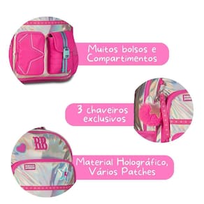 Os detalhes fazem toda a diferença: os patches emborrachados e atoalhados, o logo RB metalizado, os puxadores personalizados e o chaveiro triplo exclusivo com pompom de orelhinhas dão o toque premium e fashion que só a Rebecca Bonbon oferece.