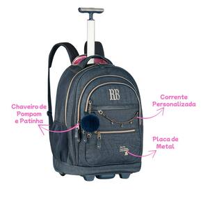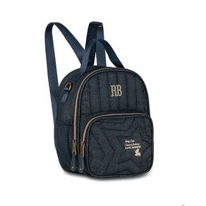 Características Mochila: - Alça de mão - Alça de costas acolchoada e Ajustável - Bolso antifurto - Bolsos Laterais - Confeccionados em material jeans com Matelassê - Chaveiros pompom com orelhinhas, plaquinhas de metal e correntinha com strass em ouro velho - Logo RB em metal - Zíper tratorado com puxadores com cadarço - Compartimentos para laptop + tablet- Forro rossa listrado