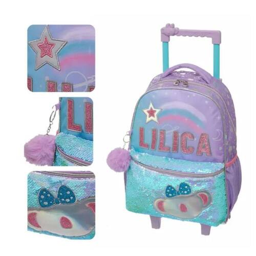 Mochila de Rodinhas Escolar Lilica Ripilica Make a Wish Feminino Coleção confeccionada em sarja de poliéster impressa. Painel frontal com impressão transfer com foil, patch de PU com Acabamento em costura e logo em PVC transparente 3D com lantejoulas dentro. Bolso frontal confeccionado em lantejoulas vai-e-vem E patch de PU holográfico com detalhes em glitter com acabamento em costura com fio metalizado. Puxadores de zíper em metal com Acabamento cromado. Etiquta de identificação impressa no painel traseiro. Etiqueta bordada costurada na lateral