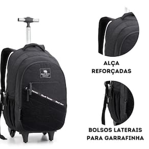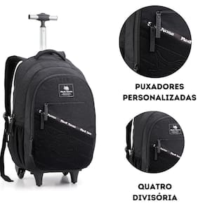 Mochila de Rodinha Com Compartimento para Notebook -Quatro divisórias -Bolsos Frontais -Bolsos Laterias porta Garrafinha -Puxadores Personalizados -Acomodação interna para Notebook de 17" e Tablet -Frente com efeito 3D -Zipér estampado -Carrinho embutido com botão de trava -Rodas de Silicone e apoio frontal -Medidas:48 x 32 x 14 cm