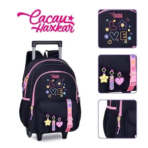 A mochila de carrinho da coleção Cacau Haxkar é aquele modelo que conquista à primeira vista, cheia de estilo, personalidade e detalhes que fazem toda a diferença no dia a dia escolar. Confeccionada em poliéster soft, traz acabamento caprichado com logo bordado, cadarços acetinados e puxadores de metal com corda, além de pingentes emborrachados super charmosos que deixam a peça ainda mais divertida e atual.