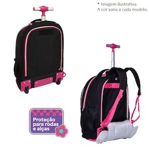 Essa mochila conta com duas rodinhas traseiras e uma base na dianteira, garantindo que ela fique estável durante o uso. Quando preferir usar nas costas, a mochila possui um protetor de rodinhas, evitando que elas sujem sua roupa.