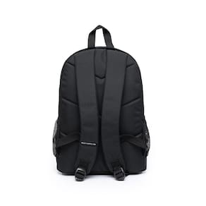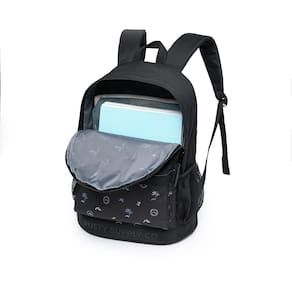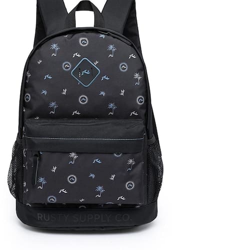 Mochila Rusty em poliéster 600D, com compartimento principal e outro menor na frente, compartimento para notebook de até 15,6", logo bordado na parte frontal e etiquetas personalizadas.