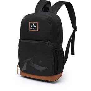 Mochila Rusty em poliéster 900D e detalhes PU, com compartimento principal e outro menor na frente, compartimento para notebook de até 15", logo bordado na parte frontal e etiquetas personalizadas.