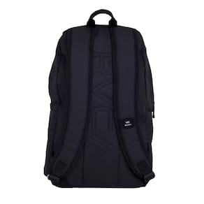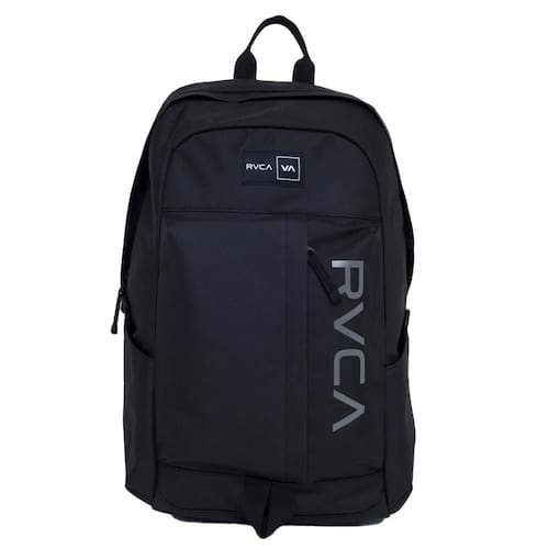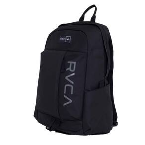 Mochila RVCA feita em tecido poliéster reciclado, compartimento superior principal em zíper, compartimentos laterais, bolso frontal com detalhe de alça, interno com divisória para notebook, alças de ombro ajustáveis, reforço texturizado na base, recorte acolchoado no traseiro com logo RVCA e frente personalizada.