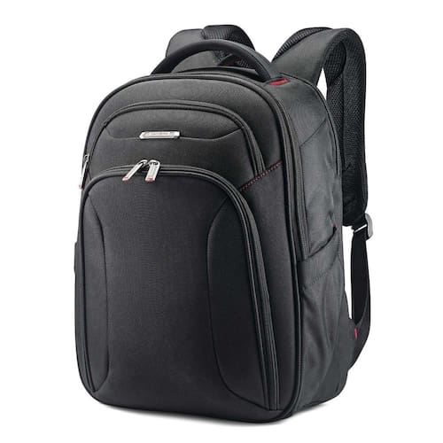 Mochila Samsonite Xenon 3.0 Checkpoint Friendly, preta, média — Construída em poliéster balístico robusto de 1680 denier para maior durabilidade — Alça de transporte superior — Blusa microinjetada com alça acolchoada de neoprene — Acessório vermelho para guardar óculos de sol e eletrônicos pessoais, como iPads e tablets — A parte traseira possui sistema de canal de ar com acolchoamento de malha de ar e suporte lombar