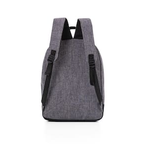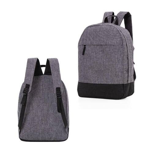 Mochila para em tecido poliéster com bolso frontal com zíper e alça de mão e ombro.