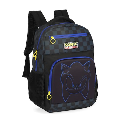 Destaques do produto: Estampa exclusiva com o rosto do Sonic em detalhe azul neon. Zíperes com puxadores personalizados em formato de anel dourado, cheios de estilo. Amplo compartimento principal + bolso frontal para melhor organização. Bolsos laterais em tela para garrafas e acessórios. Alças acolchoadas e reguláveis, garantindo conforto ao carregar.
