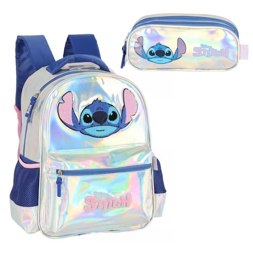 Kit Mochila De Costas Com Estojo 3 Repartições Stitch Infantil Escolar Disney
