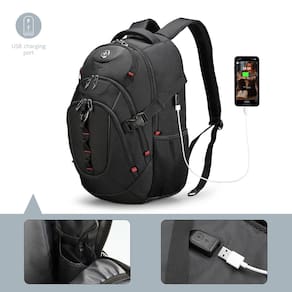 Swissdigital Mochila para laptop Design Business com porta de carregamento USB inteligente, mochila de viagem para laptops de 15,6 polegadas - Porta de carregamento USB integrada: equipada com uma porta USB que oferece acesso rápido para carregar seu telefone e outros dispositivos eletrônicos como iPhone, iPad, Kindle e todos os outros dispositivos USB convenientemente. A porta de carregamento USB integrada permite que você use o dispositivo enquanto ele carrega e caminhe ao mesmo tempo (a bateria portátil não está incluída – não é necessária uma bateria específica). EUA 10.574.071 B2; US 10.931.137 B2; US 10.931.138 B2; US 11.601.009 B2. 2 - Proteja sua privacidade com um bolso integrado de proteção RFID: viaje sem preocupações. O compartimento de proteção RFID protege seus dados pessoais de serem acessados por scanners RFID (por exemplo, cartões de crédito, passaportes e carteiras de motorista). - SISTEMA DE ADICIONAR UMA BOLSA: o sistema Add-A-Bag é conveniente para sua viagem. Uma alça de bagagem permite que você conecte sua mala à mochila e, assim, puxe com uma mão. Sua viagem se tornará imediatamente muito mais fácil e agradável. - Capacidade extra grande: contém compartimentos independentes para ótimo armazenamento e organização para diferentes itens. Vários compartimentos principais e bolsos laterais para proporcionar o espaço que suas coisas importantes precisam. - Projetada para conforto: o sistema de ventilação 3D mantém as costas frescas. As alças ergonômicas acolchoadas com curva "S": 0,8 cm a 1,3 cm mais largas do que as mochilas tradicionais, distribuem melhor o peso. Isso faz com que os ombros se sintam mais confortáveis e menos sobrecarregados.