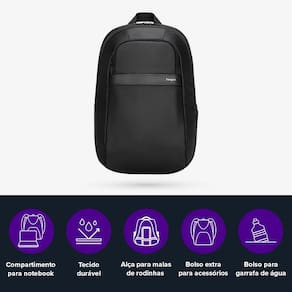 Marca: Targus Modelo: Mochila Targus Safire Plus 15.6 Preta - TBB581 Cor: Preto Compartimento acolchoado para Notebooks: Sim Tamanho do Compartimento para Notebooks: Até 15.6 Pol Tecido Durável e Repelente à Água: Sim Alça para Malas: Sim Rodinhas: Sim Bolso Frontal: Sim Bolso Lateral: Sim Garantia do Produto: 1 Ano Garantia Zíper e Costura: Vitalícia