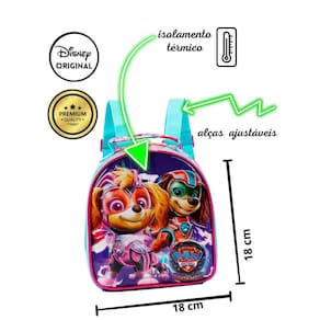Com alças de costas ajustáveis, a lancheira é fácil de carregar e oferece conforto durante o transporte. Além disso, sua estampa em alto relevo com a personagem Skye da Patrulha Canina torna a mochila ainda mais estilizada e atrativa para as crianças.