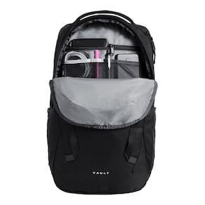 Mochila The North Face Vault Unissex - Preto A Mochila Vault é um clássico e best seller da The North Face. Renovada e com novas características modernas, conta com acabamento resistente à água non-PFC DWR não fluorado, sendo perfeita para te acompanhar na escola ou na faculdade, no trabalho e até mesmo na academia. Possui capacidade de 26 litros e armazena seu laptop num compartimento exclusivo e acolchoado, protegendo-o de impactos, e seu amplo compartimento principal comporta seus materiais, livros e aparelhos eletrônicos tranquilamente. A Vault preserva seu sistema de suspensão FlexVent tm com as alças para os ombros flexíveis moldadas por injeção, costeira acolchoada em mesh extremamente confortável, estabilizador peitoral e painel lombar altamente respirável para máxima ventilação o dia todo. E seu novo design desenvolvido com duas alças superiores permitem a abertura mais fácil, assim como o transporte perfeito e equilibrado quando carregada pela mão, além da mochila ficar em pé para facilitar o armazenamento e a retirada de seus pertences. Já seu compartimento frontal aperfeiçoado simplifica sua organização com espaço para armazenagem com bolsos com zíper, compartimento para tablet e alça para chave. Também conta com pontos de amarração daisy chains externos e dois bolsos para transportar garrafas de águas, além de 360 graus de refletividade que aumenta a visibilidade enquanto estiver em movimento, garantindo a sua segurança. Recursos da mochila