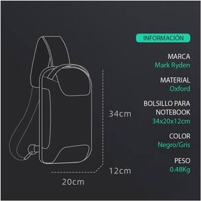 Marca: Mark RydenModelo: ViperStyle: bolsa tiracolo, bolsa de peito, bolsa de ombro\ nTamanho: 34* 20* 12 cm\ nPeso: 0,48 kg\ nCaracterísticas: -Design anti-roubo - Fecho YKK (15 vezes mais forte que o fecho de nylon tradicional)\ n-1 Porta de carregamento USB - Protegido à prova d'água com vários bolsos (bolso para iPad de 9,7 polegadas) - 7 bolsos multiuso resistentes à abrasão para uso constante: fecho repelente à água; bolso traseiro antifurto; sutiã de mão confortável; encosto acolchoado com tecnologia respirável