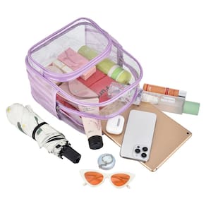 Busiuw Mochila transparente para eventos de estádio 30 x 30 x 15 cm para concertos esportivos, trabalho, viagens (roxo claro) - ?Mochila transparente para eventos de estádio?Tamanho 29 cm C x 15 cm L x 24 cm A, cumpre sem esforço as políticas de bolsas transparentes de não maiores que 30 x 30 x 15 cm, tornando-a ideal para estádios, shows e eventos esportivos. - ?Segurança de passagem sem complicações?A mochila transparente permite visibilidade completa. Passe pela segurança com a mochila transparente para evitar ser virada no portão do aeroporto ou estádio, e é benéfica sem perder tempo escolhendo os itens que você carrega. - ?Design prático?As alças acolchoadas reforçadas ajustáveis adicionam conforto macio para uso durante todo o dia. A alça superior é ideal para carregar sua bolsa enquanto alivia seus ombros. Seu design de mochila feminina moderna a torna um excelente acessório para qualquer roupa. - ?Resistente e durável?Material de PVC resistente utilizado para tornar nossa mochila transparente grossa, à prova d'água, bem feita e garantida para durar muito tempo. NOTA: para evitar que a água penetre pelo zíper, não mergulhe na água ou deixe do lado de fora em uma chuva forte. - ?Uso versátil?: a mochila transparente é ideal para roupas femininas de shows, festivais, trabalho e eventos esportivos. Também é ótima para viagens e outros eventos com políticas de bolsa transparente.