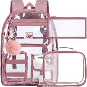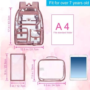 CCJPX A mochila transparente é leve e durável, feita de PVC resistente ao frio. Totalmente transparente e resistente à água, o que ajuda a manter os deveres de casa, livros, pastas e arquivos secos e protegidos. A alça de ombro durável é muito confortável e muito macia. Transparência da mochila com estilo simples e elegante, é boa para jogos de estádio, escola, viagens, aeroportos etc. Variedade de cores à escolha. - ?Alta capacidade?- A mochila transparente mede 43 x 32 x 15 cm, a lancheira mede 24 cm (C) x 19 cm (A) x 7,6 cm (L), o estojo de lápis mede 22 cm (C) x 12 cm (A) x 0,5 cm (L). Além disso, daremos a você uma bola de pele fofa e dois emblemas fofos como acessórios. - ?Material superior?- esta mochila transparente é feita de material plástico ecológico durável que atende aos padrões de segurança. Alças de ombro ajustáveis e zíperes duplos suaves, fácil de carregar com abertura e fechamento. - ?Elegante e conveniente?- a mochila transparente oferece visibilidade completa do conteúdo, ajuda você a passar pelas verificações de segurança mais rapidamente. Costura reforçada em qualquer lugar e zíperes suaves da mochila transparente resistente, seu artesanato permite que você tenha mais capacidade e você não se preocuparia com o rasgo facilmente. - ?Leve e confortável?- esta mochila transparente tem um compartimento principal de grande capacidade com uma alça de malha para pastas etc. O compartimento frontal é equipado com dois bolsos espaçosos para ferramentas, e também há dois bolsos de malha na lateral para copos ou guarda-chuvas. - ?Uso multiuso?- esta mochila infantil transparente pode ser usada não apenas na escola, mas também em festivais de música, eventos esportivos e viagens, etc., é fácil passar pela verificação de segurança rapidamente, o que pode atender às suas necessidades diárias ou ser usada como um presente festivo para as crianças.