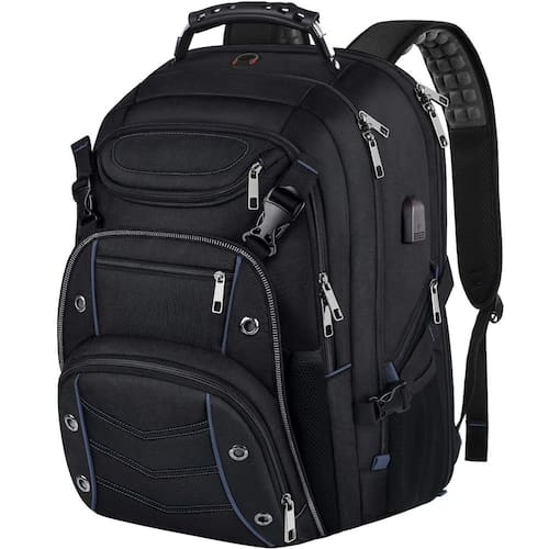 Mochila de viagem extragrande de 46,7 cm para laptop para jogos, porta de carregamento USB, aprovada pela TSA, antifurto, viagem, grande capacidade, para computador, mochila para homens, mulheres, negócios, GG, mochila de trabalho - Mochila extragrande para laptop para jogos -- Tamanho externo da mochila de viagem de negócios extragrande: 56 x 43 x 25 cm. Capacidade: 60 L. Vários compartimentos oferecem excelente proteção para 2 laptops e tablets. Serve para a maioria dos laptops de 19,18,4,18,17,17,15,6,15 cm - Porta de carregamento USB de grande capacidade: o maior compartimento principal comporta roupas de viagem de 3 a 4 dias. Muitos bolsos ocultos podem acomodar muitos acessórios de viagem, artigos de papelaria, artigos de higiene pessoal, bolso lateral com zíper para facilitar o acesso essencial, porta USB externa com cabo de carregamento integrado oferece carregamento conveniente do seu celular e outros dispositivos eletrônicos. Um orifício para fone de ouvido externo facilita o acesso ao uso do fone de ouvido. Mochila XL resistente feita de tecido de nylon e poliéster - Antifurto RFID aprovado pela TSA: desdobra a mochila extra grande 90 a 180 graus, fazendo você passar rapidamente pela segurança do aeroporto e manter os itens organizados, projetada para viagens de avião. Mochila grande para atividades internas/externas, serve como mochila para laptop. Bolso RFID com identificação por radiofrequência RFID ajuda a proteger os dados pessoais codificados em seus cartões de crédito, documentos e passaportes. Bolso na parte de trás da mochila, fácil de colocar seu telefone, bolsa e passaporte - Mochila esportiva: para jogadores, espaço para todos os seus equipamentos esportivos para que eles não percam nada, um lugar para tudo: garrafas de água, guarda-chuva, chuteiras, meias, protetores de canela, jaqueta, lanches. O mais especial é o bolso externo, com alças de compressão ajustáveis para basquete, rúgbi e vôlei de tamanho completo - Alça traseira para bagagem: o design de ventilação em forma de U nas costas ajuda na convecção de ar. Alças de ombro ajustáveis com acolchoamento ajudam a aliviar o desconforto do seu ombro. Uma alça de bagagem permite que a mochila se encaixe na bagagem/mala, deslize sobre o tubo da alça vertical para facilitar o transporte; a alça ajustável deixa as alças de ombro mais apertadas. Além disso, mochila com uma alça robusta e resistente com cabo de aço na parte superior para transporte