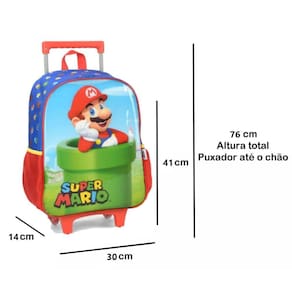 Mochila De Rodinhas Mario Bros Luxcel Infantil Escolar A Mochila Infantil Rodinhas Super Mario é a companheira perfeita para os pequenos fãs desse icônico personagem dos games. Com um design incrível e detalhes inspiradores, essa mochila vai encantar as crianças. Com bolsos laterais especiais para garrafinhas de água, seus filhos poderão se manter hidratados durante todo o dia escolar. Além disso, a mochila possui uma alça de mão resistente, facilitando o transporte quando necessário. E não se preocupe caso seu filho(a) acabe perdendo sua mochila por engano. A Mochila Infantil Rodinhas Super Mario tem um identificador no verso para você escrever o nome da criança, garantindo que ela sempre volte para casa em segurança. Características da Mochila Escolar: - 1 Bolso Principal com bastante espaço - 2 Bolsos laterais para squeeze - Alça de mão reforçada na parte superior - Carrinho em metal e rodinhas de silicone - Fecho com zíper - Taggy identificação - Material: 70% Poliéster e 30% PVC Dimensões da Mochila Escolar: Altura: 41 cm Largura: 30 cm Profundidade: 14 cm Conteúdo: - 1 Mochila