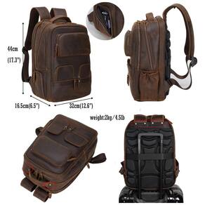 Almofada ergonômica e alça de bagagem A parte de trás da mochila de couro é feita de acolchoamento macio e respirável, cujo design côncavo e convexo está em conformidade com a ergonomia, à prova de suor, confortável e também com equilíbrio de peso para reduzir a carga de transporte. A alça de bagagem pode segurar a mochila em uma mala que pode facilitar sua viagem. Dimensões da mochila 32 x 16 x , pesos 2kg , 4,5lbs, alças ajustáveis 52 , largura dos ombros .
